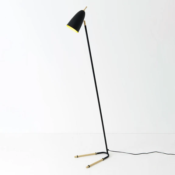Az arany-fekete alap v-alakú, és biztosítja a szükséges stabilitást. A hosszú, keskeny, túlnyomórészt fekete színű összekötő elem a kúpos lámpaernyőbe vezet. Ez kívül fekete, belül aranyszínű, és a tetején egy praktikus és vizuálisan harmonikus kapcsolóval rendelkezik. Ez a lámpa az árnyékoló belső részének köszönhetően a közvetlen és a közvetett világítás különleges kombinációját hozza létre.