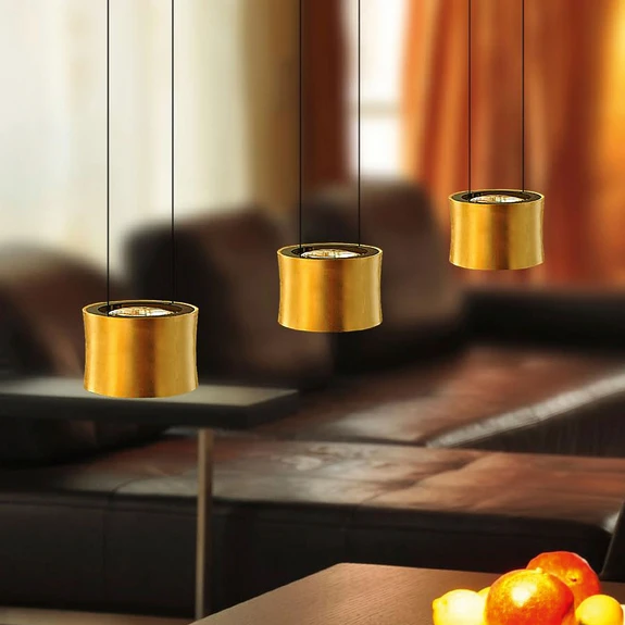 Háromlámpás Impulse LED-es függőlámpa levélarany színben, közvetlen és közvetett fénnyelA Luce Elevata sorozat Impulse függőlámpája elegáns és modern megjelenésű az egyszerű design és az aranyszínű kivitel jellegzetes kombinációjával. A németországi BANKAMP által gyártott LED-es függőlámpa hosszú, vasból készült baldachinnal rendelkezik, amelyről három alumíniumból készült hengeres fényelem lóg le. Ezek felső és alsó oldalán átlátszó üvegből készült lencsékkel és burkolatokkal vannak ellátva, amelyek meghatározott kúpok formájában közvetlen és közvetett fénykibocsátást biztosítanak. A beépített LED-ek meleg fehér színt sugároznak, és biztosítják a színek valósághű reprodukálását a helyiségben. A külső fázisvágásos dimmerek lehetővé teszik a fénykibocsátás beállítását. - A függő magassága 90 és 150 cm között állítható, ha fel van szerelve