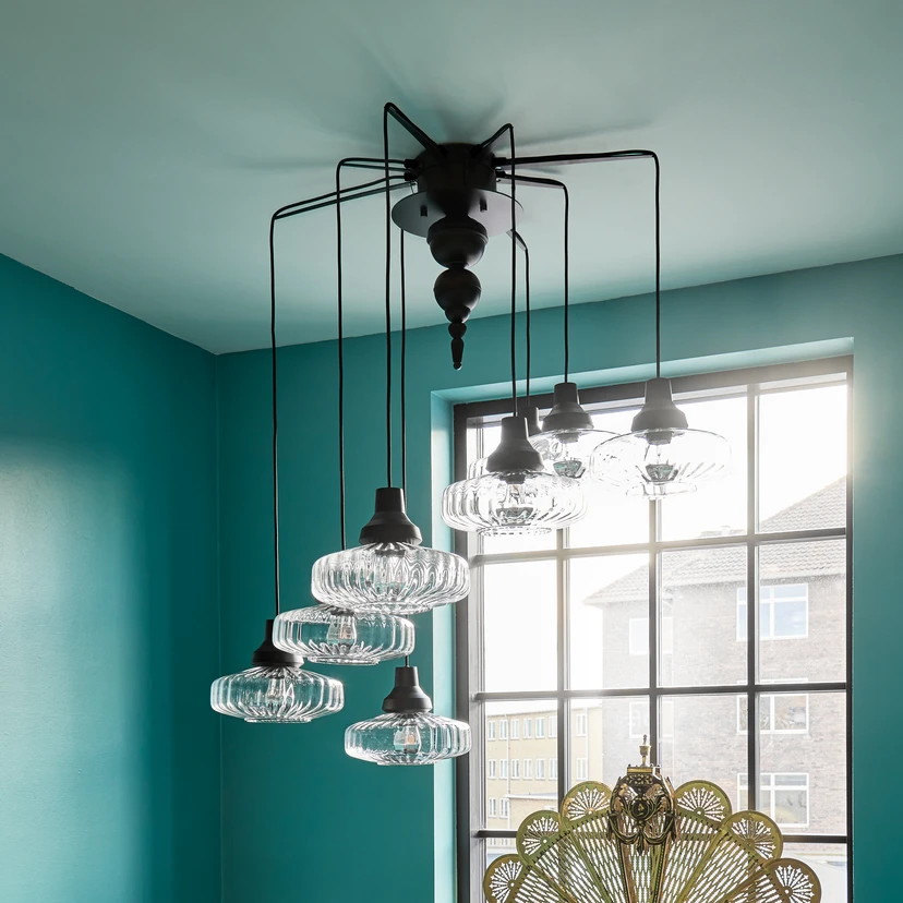 Rugalmasan testreszabható: Flash Your Lamps Deluxe vas baldachin akár 8 függőlámpához A Flash Your Lamps Deluxe baldachin egy állítható felfüggesztési rendszer akár nyolc függőlámpához. Lakkozott vasból készült, és középen egy szemet gyönyörködtető díszítés díszíti. A különböző hosszúságú karok kivehetők és tetszés szerint elhelyezhetők, hogy személyre szabott összképet hozzanak létre. A gyártó DESIGN BY US különösen ajánlja a Ballroom és New Wave sorozatú saját függőlámpáival való használatát, de természetesen sok más függőlámpa is elegánsan színpadra állítható ezzel a függesztőrendszerrel. Megjegyzés: Csak a baldachint szállítjuk. Az ábrázolt lámpák nem tartoznak a szállítási terjedelemhez.