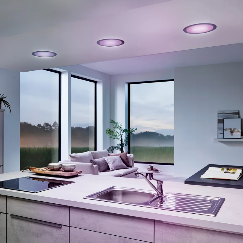 Alkalmazáson keresztül vezérelhető - Fueva Connect süllyesztett LED-es spotlámpa matt nikkelben A Fueva Connect egy süllyesztett LED-es spotlámpa, amely rugalmas helyiségvilágítást biztosít. Kortárs módon vezérelhető egy okostelefonon vagy táblagépen lévő alkalmazással, vagy alternatívaként egy tartozékként rendelhető távirányítóval. A tableten vagy okostelefonon keresztül történő Bluetooth-vezérléshez egyszerűen töltse le az IOS és Android rendszerekre elérhető ingyenes alkalmazást. Egyéb tartozékra nincs szükség. Az otthoni világítás utazás vagy nyaralás közben is vezérelhető, például a jelenlét szimulálására. A beállítások biztonságosan és titkosítva tárolódnak egy felhőben, és bármikor elérhetők. A világítás kialakításának lehetőségei szinte korlátlanok. A 16 millió színárnyalat vagy fehér fény közül a melegfehértől (2700 K) a nappali fényig (6500 K) terjedő tartományban lehet kiválasztani a fény színét. Az egyes fényszínek fényereje fokozatmentesen szabályozható. A színváltások különböző sebességgel állíthatók be, és speciálisan létrehozott vagy előre beállított fényforgatókönyvek is előhívhatók, mint például a hálószobában ébresztő napfelkelte. A Fueva Connect süllyesztett LED-es spotlámpa bármilyen belső térbe illeszkedik, és több süllyesztett spotlámpa felszerelése esetén egy egész helyiség megvilágítására használható. A fény okostelefon nélküli vezérléséhez a tartozékok közé tartozik egy távirányító, amellyel szinte ugyanazok a beállítások végezhetők el.