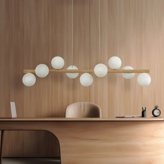 Estera függőlámpa fagerendával és kilenc gömb alakú opálüveg árnyékolóval Az Estera függőlámpa kilenc gömb alakú opálüveg árnyékolóval, amelyek mindegyikében egy-egy G9 foglalat található, minden oldalról kellemes megvilágítást biztosít. Világos színű fából készült gerenda és fehér fém baldachin is van.