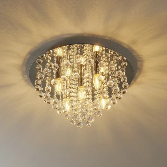 Ez a kerek mennyezeti lámpa azonnal megragadja a tekintetet, mivel a díszesen megmunkált üvegből készült függesztékkel rendelkezik. A tükörlemez még hatékonyabbá és ragyogóbbá teszi az amúgy is lenyűgöző lámpatestet. A krómszínű foglalat semleges jelleget kölcsönöz a mennyezeti lámpának, így az bármilyen belső stílushoz illeszkedik
