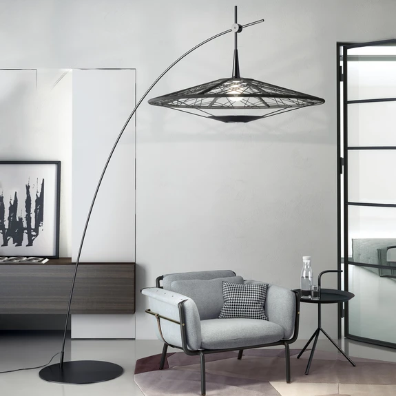 Carpa állólámpa, mozgatható ernyővel A Carpa nagyméretű állólámpa ívlámpához hasonlóan kialakított, nagyméretű keretes állólámpa mindenekelőtt szokatlan kialakításával nyűgöz le. Jette Scheib tervező nagyra értékeli a geometrikus formákat, és hagyományos anyagokat használ az ilyen drótkötélszerkezetek megalkotásához. Meggyőződése, hogy egyetlen bútordarab, legyen az bármilyen szép is, sem tud teljesen kibontakozni a megfelelő világítás nélkül, ezért olyan funkcionális termékeket tervez, amelyeknek ereje van a jó közérzet megteremtésére. Ezt a Carpa esetében sikerült elérnie - a lapos, nagy, lefelé nyíló árnyékoló ernyő drótból és pamutból szövött. Az összetéveszthetetlen forma atmoszférikus fényt biztosít, amelynek hatását a szándékos részletek befolyásolják. A használandó fényforrás alatt finom merevítők tartják a középen beépített lyukkal ellátott, lefelé ívelt tálat. Ennek eredményeként a fény a padlófelület felé irányul, de a fémfelületről visszaverődik és felfelé is visszaverődik, ahol a pamutszövés finom hálóján keresztül tör elő, és varázslatos mintákat rajzol a helyiségbe. A stabil, kerek talapzat tartja a kiálló, kecses kart, és biztosítja a szükséges stabilitást. A fekete megjelenés kompromisszumok nélkül illeszkedik számos lakberendezési stílushoz, és egy dekoratív és praktikus világítótesttel gazdagítja a lakótérséget, amely akár egy nagyméretű kanapé mögé is elhelyezhető. A működtetés könnyedén, lábkapcsolóval történik.