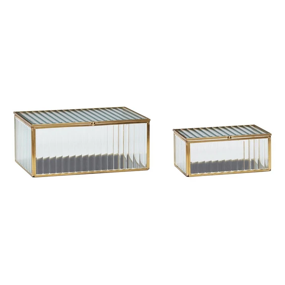 Két üvegdoboz sárgaréz színű fémkerettel Az átlátszó üvegdoboz elegáns és kifinomult kialakítású. Használja az üvegdobozt sokféle célra, pl. dísztárgyak vagy ékszerek bemutatására. A hullámos üveg eleganciát kölcsönöz, az aranyszínű részletek pedig stílusos megjelenést biztosítanak. Ez a termék kézzel készült, ezért változhat.