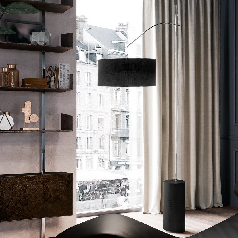 Stílusos Gru ívelt állólámpa alumíniumból és szövetből, hengeres lámpaernyővel