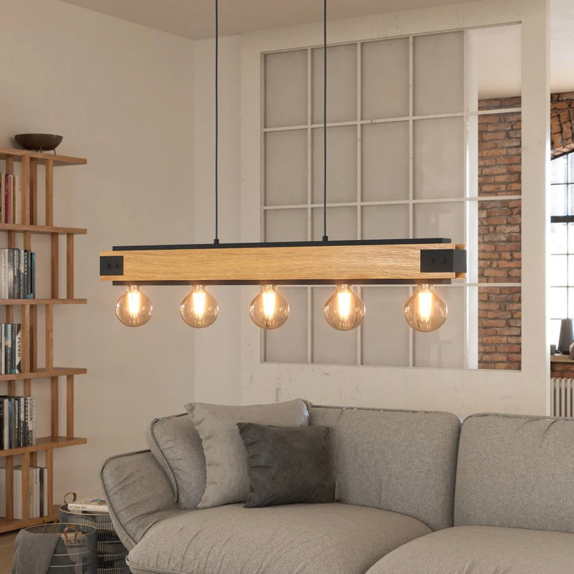 Layham függőlámpa, fekete/világos fa, hossza 96 cm, 5 lámpás.
