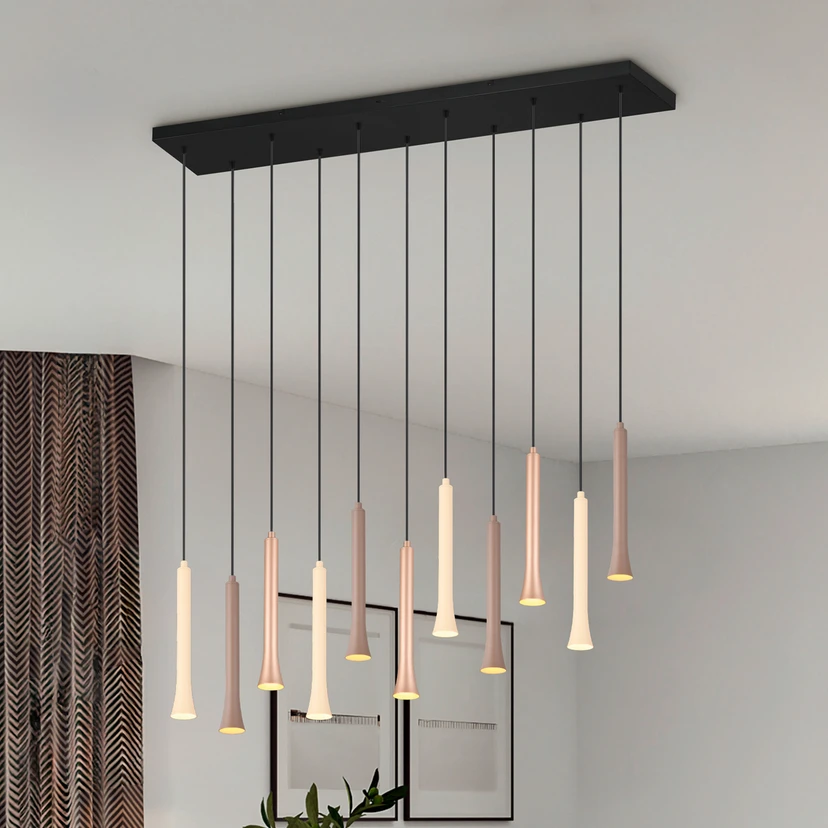Fiato LED-es függőlámpa, 11 lámpás, hosszú forma A fekete, téglalap alakú baldachinról 11 henger alakú, taupe és kávé színű lakkozott árnyalat lóg le. Ezek LED-ekkel vannak felszerelve, amelyek fényszíne a lámpatesten található kapcsolóval állítható, választhatóan meleg fehér (2300 K), meleg fehér (3000 K) vagy univerzális fehér (4000 K) színben. A világítás a falon lévő fénykapcsolóval fokozatosan is tompítható. A Fiato LED-es függőlámpa vizuális és műszaki szempontból is kiemelkedő darab.
