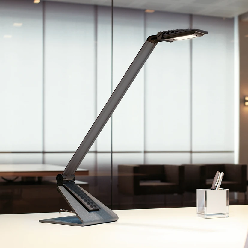 Innovatív MAULsolaris LED asztali világítás a világos munkahelyért A Németországban kifejlesztett és gyártott MAULsolaris LED asztali világítás az innovatív technológiát és a futurisztikus dizájnt ötvözi. A legújabb generációs, nagy teljesítményű, hosszú élettartamú LED-ek 4000 Kelvin-fokos, általános fehér fényt és 2520 lux fényerősséget biztosítanak 35 cm távolságból. A PMMA diffúzor homogén fényeloszlást és optimális káprázásvédelmet biztosít. A kar és a lámpafej eloxált alumíniumból, az illesztések pedig törésálló műanyagból készülnek. A fej 150°-ban elforgatható és 55°-ban dönthető, a keret pedig állítható magasságú. A porszórt fém talpazat az íróasztal védelme érdekében párnával van ellátva. A tápegység és a kapcsoló a talpba van beépítve.