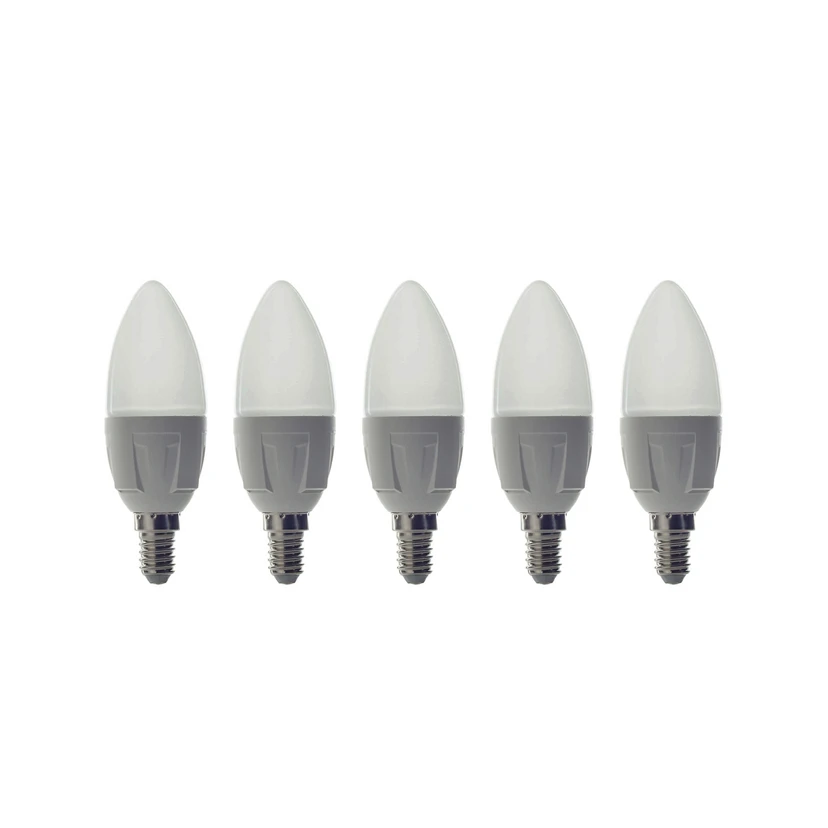 E14 4,9 W-os LED-gyertyalámpa, matt, melegfehér (3000 K), 5 darabos készletben Kompakt méreteinek és matt üveg izzójának köszönhetően ez a LED-es fényforrás különösen alkalmas nyitott lámpatestekben való használatra anélkül, hogy vakító fényt okozna. A rendkívül hatékony LED-technológiának köszönhetően akár 44 W-os hagyományos gyertyalámpát is helyettesíthet, ugyanakkor akár 80 % energiát is megtakaríthat. A LED-technológia további előnyei a bekapcsolás után azonnal teljes fényáram és a rendkívül hosszú, akár 30 000 órás élettartam. Műszaki adatok: - A LED-technológiának köszönhetően akár 80 %-os energiamegtakarítás - Rendkívül hosszú, akár 30 000 órás élettartam - 100 %-os fény azonnal bekapcsolás után (kevesebb mint 1 másodperc) - Rázkódásra érzéketlen - Higanymentes - Nem fényerőszabályozható - Teljesítménytényező > 0,6 - A lámpa fényáramának fenntartása ≥85 % az átlagos élettartam 75 %-ánál - 5 lámpából álló praktikus készletben szállítva