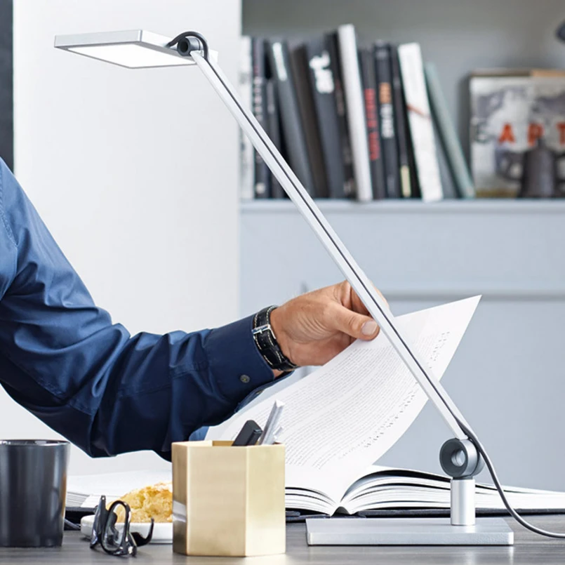 PARA.MI MFTL 108 R, rugalmasan állítható és irányítható Dimmelhető irodai asztali lámpa Nagyfokú kényelem, hatékony technológia és modern design jellemzi ezt a LED-es irodai asztali lámpát. A szögletes, stabil talppal és egy ugyanilyen szögletes, kristálytiszta burkolattal és műanyag reflektorral ellátott lámpafejjel felszerelt PARA.MI egy egyszerű, letisztult, kecses kialakítású világítóelem. A merev kar egy csuklóval kapcsolódik a talphoz, ami nagyfokú mozgékonyságot és ezáltal a fénysugár rugalmas irányíthatóságát biztosítja. A lámpafej elforgatható és dönthető is. Ez biztosítja, hogy a munkahely mindig optimálisan legyen megvilágítva. A fejen található vezérlőgombon keresztül fokozatmentesen szabályozható fényerőszabályozással és az automatikus kikapcsolás állítási lehetőségével, valamint a magas színvisszaadással együtt az asztali lámpa átfogó, alkalmazkodó világítást kínál, amely minden munkahely számára előnyös.