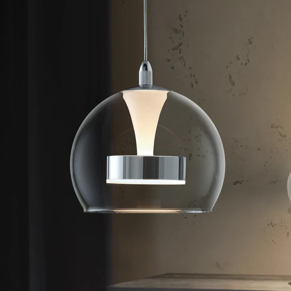 Kapcsolóval és fényerőszabályozóval felszerelve: a fényerő egyszerűen beállítható a normál fali kapcsolóval – további technika nélkül. A DIP-kapcsolóval a fényszín közvetlenül a világításon állítható be. A Flynt lógó világítás elegáns króm megjelenésű fémből készült, átlátszó üveggel kombinálva. Ezek az anyagok a világításnak nemes, modern megjelenést kölcsönöznek, ugyanakkor nyitott, légies fényhatást biztosítanak – tökéletesek a modern, igényes lakóterekhez, ahol fontos a design és a funkcionalitás.