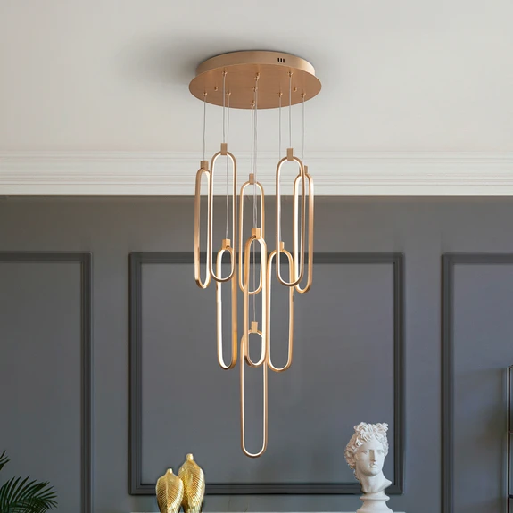 Colette LED lógó világítás 9 fényelemmel, rózsaarany, dimmelhető A Colette LED lógó világítás modern dizájnjával és elegáns rózsaarany színével nyűgöz le. Kiváló minőségű alumíniumból és szilikonból készült, így zökkenőmentesen illeszkedik a nappali- és étkezőszobákba. Kilenc hosszú, ovális keret alkotja a világítóelemeket, amelyek belsejébe LED-eket szereltek. Ezek energiatakarékos, meleg fehér fényt biztosítanak, amely kellemes hangulatot teremt. A világításba egy dimmelhető Led vezérlő került beépítésre, így a világítás külső fényerőszabályozóval - Triac vagy 0-10V - is tompítható.