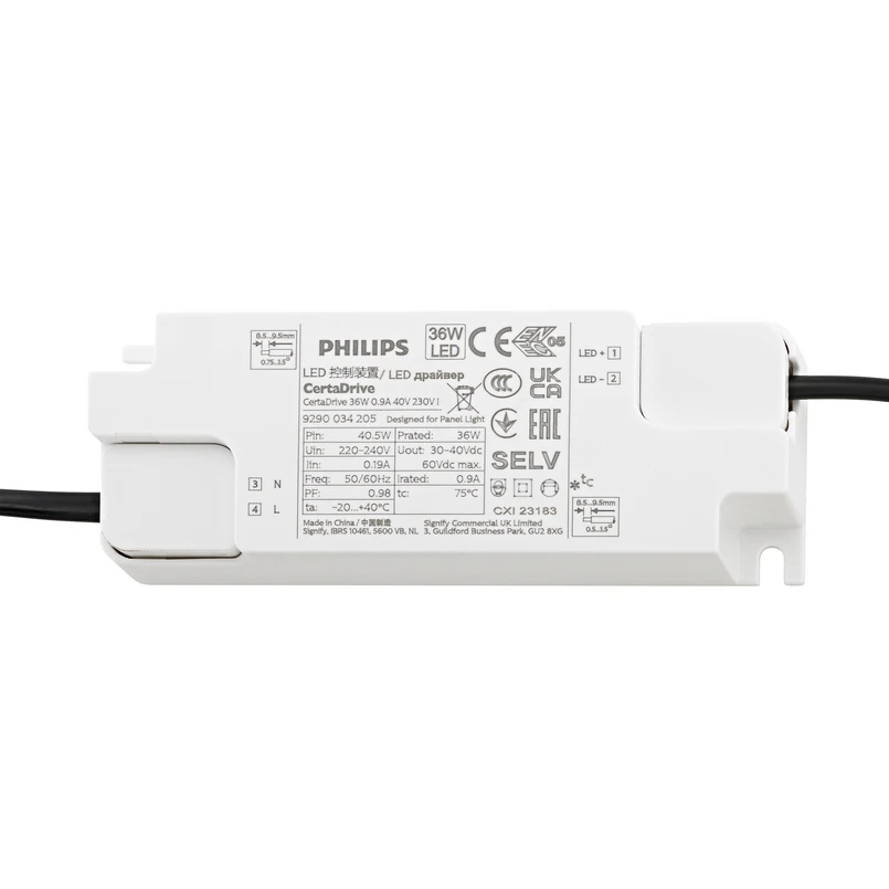 LED-meghajtó Powerline Panel CC, 36 W, 900 mA A Philips által gyártott Powerline Panel CC állandó áramú meghajtó a Sigor Fled Backlit LED panel tápellátását biztosítja. A meghajtó ENEC-tanúsítvánnyal rendelkezik, és villódzásmentes megvilágítást biztosít. A csatlakoztatott kábelek minimálisra csökkentik a telepítési erőfeszítést. Műszaki adatok - Hálózati feszültség: 230 V - Váltakozó feszültségtartomány: 220 - 240 V - Egyenfeszültségtartomány: 30 - 40 V - Névleges áram (230 V, 50 Hz, teljes terhelés): 900 mA - Teljesítmény (230 V, 50 Hz, teljes terhelés): 41 W - Kimeneti feszültség: 40 V - Kimeneti teljesítmény: 36 W - Állandó áram tartomány: 900 - 972 mA - Rövidzárlatbiztos: igen - Hőmérsékletvédelem: igen - Hőmérséklet-tartomány: -20 - 40 °C között