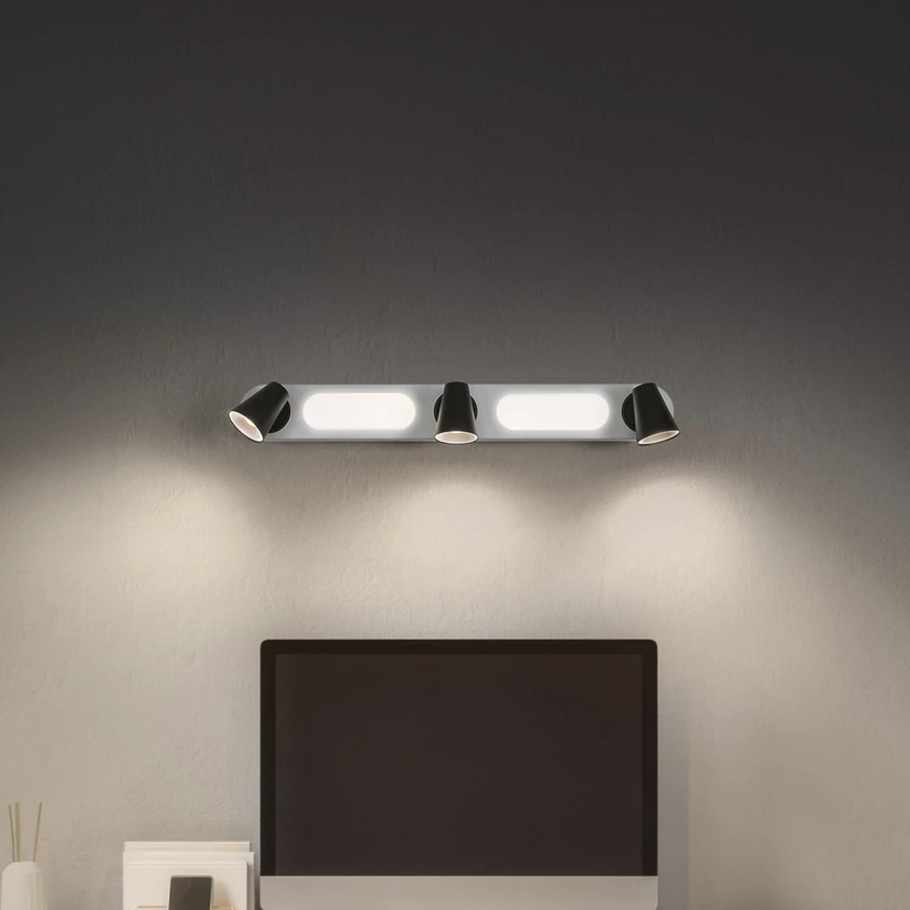 Neptun LED mennyezeti lámpa három spot- és a baldachinban lévő fényforrással A Neptun acélból készült LED mennyezeti lámpa öt fényforrással van felszerelve - a három állítható spotba és a két ovális, szaténozott műanyagból készült burkolat mögötti baldachinba melegfehér LED-eket szereltek. A fényforrások külön-külön vagy együttesen is bekapcsolhatók a fali fénykapcsolóval. Ez a 3 fokozatú kapcsoló (Click Select) lehetővé teszi a környezeti világítás bekapcsolását a baldachinban, a három spotlámpában vagy mindkettőben együtt - Állítható spotlámpák - Szerelési és csatlakozási tartozékokat tartalmaz