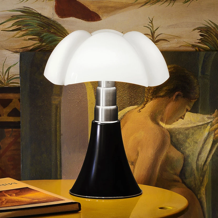 Ez az asztali lámpa a Pipistrello sorozathoz tartozik, amelyet Gaetana "Gae" Aulenti (1927 - 2012) olasz építész és formatervező már 1965-ben tervezett, és amelyet a Martinelli Luce gyártó még ma is gyárt. Ahogy a neve is mutatja, a Minipistrello egy kisebb változat. A technológia a kézreálló méretekhez is igazodik. Így a LED-es asztali lámpa áramellátás nélküli helyeken is elhelyezhető és működtethető, mivel újratölthető akkumulátorral van felszerelve (USB-Micro-USB töltőkábel tartozék). A működtetés a talpba épített kapcsolóval történik, amely egyben érintésvezérlésű fényerőszabályzó is.
