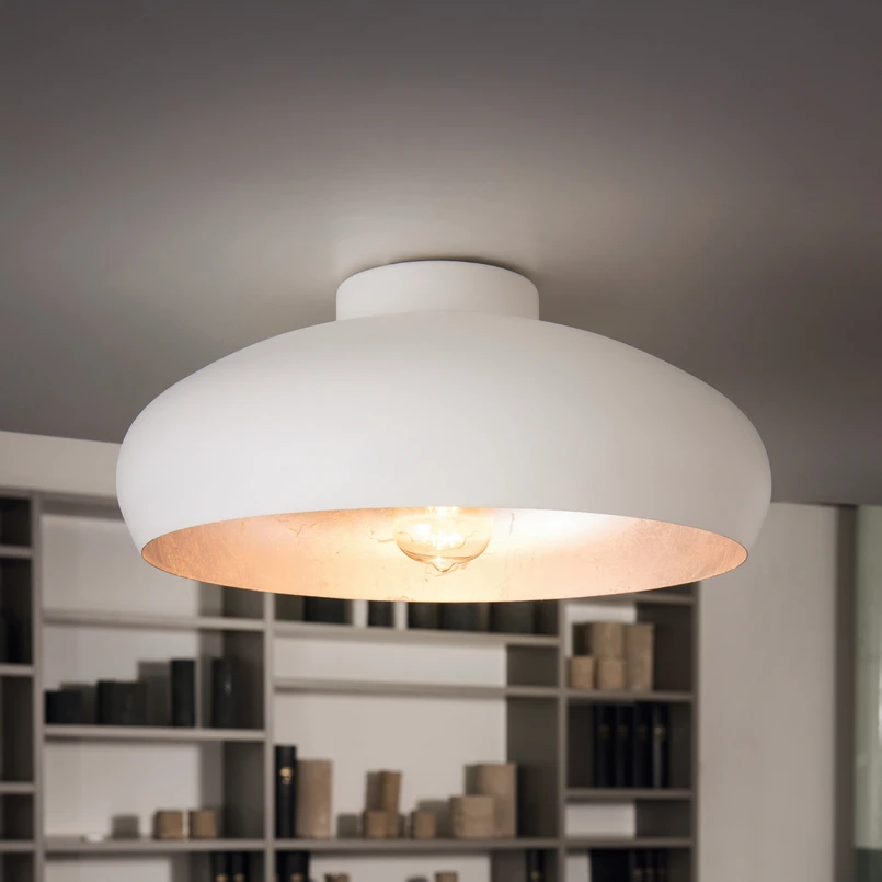 Időtlenül szép Mogano mennyezeti lámpa ezüstszínű belsővelA Mogano mennyezeti lámpa 40 cm átmérőjű, félhéj alakú fém lámpaernyőjével számos helyiség alapvilágításához ideális. Az egyébként fehér színű ernyő ezüstszínű belsejének köszönhetően a fény csodálatosan szóródik a környezetbe. Az egyszerű és időtlen dizájnnak köszönhetően a lámpa számos lakberendezési stílussal és színkoncepcióval harmonizál. Az E27-es foglalatba minden típusú, legfeljebb 60 W-os izzó becsavarható, így energiatakarékos LED-izzókkal is működtethető.