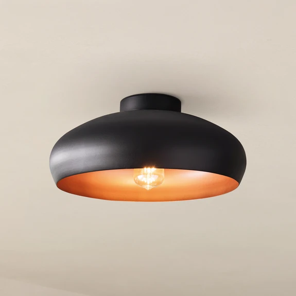 Kívül fekete, belül fényes réz - Mogano mennyezeti lámpaA Mogano mennyezeti lámpa félhéj alakú lámpaernyőjét belülről fényes rézréteggel borították, amely nemcsak csodálatos kontrasztot alkot a fekete külső dizájnnal, de bekapcsoláskor gyönyörű fényvisszaverődést is eredményez. Így nemcsak maga a belső tér kerül optimálisan színpadra, hanem a fényvisszaverődések a lámpabúrából kilépő fénysugarat is kissé felerősítik. Ez különösen kellemes fényképet teremt a helyiségben, ami határozottan fokozza a hangulatos szobaklímát.