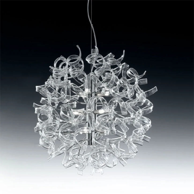 Rugalmas, krómozott rézkarok és 42 kézzel formázott kristályüveg elem biztosítja ennek a modern függőlámpának az egyediségét és érdekes fényjátékát.