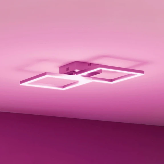 tint LED mennyezeti lámpa Cano, intelligens vezérelhető A fémből készült tint LED mennyezeti lámpa Cano két négyzet alakú fémkerettel van felszerelve, amelyekben a LED-ek szaténozott burkolatok mögött vannak elhelyezve. A szupermeleg fehér fénytől (1800 K) az aktiváló nappali fényig (6500 K), valamint RGB színes fényt (akár 16 millió szín) kínál. A kiváló minőségű, szögletes fémházzal és a rugalmas optikát biztosító, mozgatható lámpatesttel ellátott lámpatest intuitív módon vezérelhető a tartozékként kapható árnyalat-távirányítóval. Előre beállított fényjelenetek a "Romantic"-tól a "Party"-ig, egyénileg beállítható fénycsoportok, hangvezérlés az Amazon Alexa segítségével az összes integrált Zigbee Smart Home Hub-gal rendelkező Echo készülékkel, például Echo (4. generációs), Echo Plus, Echo Studio, Echo Show 10, vezérlés Bluetooth-on keresztül az ingyenes "tint Smart Light" alkalmazással további eszközök nélkül - mindezek a vezérlési lehetőségek lehetségesek. A lámpa Smarthome ready, ami azt jelenti, hogy számos elterjedt Smarthome rendszerbe integrálható Zigbee átjáróval, például Philips Hue, MagentaZuhause, Samsung SmartThings vagy Amazon Alexa segítségével az integrált Zigbee Smart Home Hub-mal rendelkező Echo eszközökön keresztül.