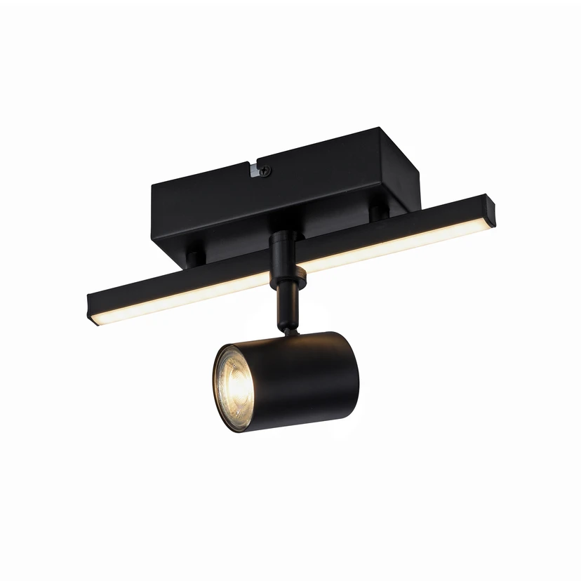 Barik LED mennyezeti spotlámpa két külön kapcsolható fényforrással A fekete Barik mennyezeti spotlámpa technikailag modern kialakításával nyűgöz le. A mennyezeti lámpa fénypontja a sínben elforgatható és állítható, így optimálisan igazítható a helyiségben. A fali és mennyezeti lámpa kellemes meleg fehér fényt bocsát ki. A sín, amelyre a spotlámpa van rögzítve, LED-csíkkal is fel van szerelve, ami hozzáteszi azt a bizonyos pluszt. A beépített soros kapcsolónak köszönhetően a fali kapcsolóval egyszerre mindkét fényforrás bekapcsolható, csak a szalag fénye kapcsolható be, vagy csak a spotlámpa kapcsolható be. Egy GU10-es izzó a tartozék részét képezi. A memória funkció segítségével az utolsó beállítások automatikusan elmentésre kerülnek. A fali- és mennyezeti lámpa alacsony függesztésének köszönhetően alacsony mennyezetű helyiségekbe is alkalmas.