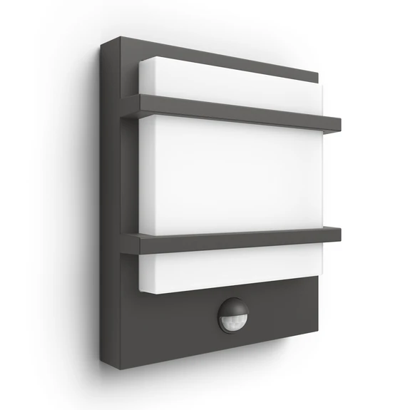 Mozgásérzékelővel és ultrahatékony LED-modullal: A Petronia kültéri fali lámpa antracit színű, robusztus alumíniumból készült, és időtlen megjelenésének köszönhetően számos homlokzati dizájnhoz illeszkedik. A fényforrás a Philips ultrahatékony LED-modulja, amely akár 50%-kal kevesebb áramot fogyaszt, mint a Philips hagyományos LED-es lámpái. A beépített mozgásérzékelő biztosítja, hogy a fény csak akkor kapcsoljon be, amikor szükség van rá. Az érzékelő műszaki adatai: Érzékelési szög: 110°, távolság: 0-10 m, világítási időtartam: 5 sec-12 perc, nappali fényérzékenység: 30-200 lux