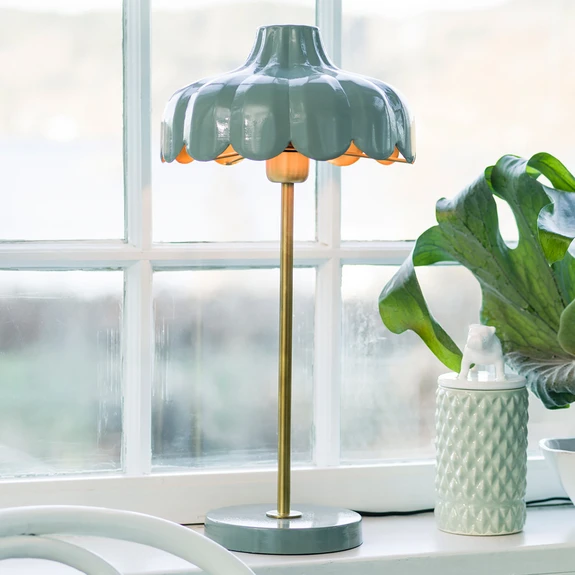 Kézzel készített Wells fém asztali lámpa A Wells asztali lámpa különleges virágmintájával hívja fel magára a figyelmet, így kikapcsolt állapotban is dekoratív hangsúlyt ad a lakótérben. A lámpa kézzel készült fémből, zöld színű talapzatból, zöld színű ernyőből és aranyszínű keretből áll. Az ernyő belseje szintén aranyszínű, és kellemes csillogást biztosít. A be-/kikapcsoló egy műanyag kábelen található, és kb. 30 cm-re van a lámpától. Az izzó nem tartozék. Mivel minden egyes lámpa kézzel készül, a méretekben kisebb eltérések lehetnek.