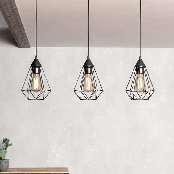A vintage dizájnú Tarbes függőlámpa egy kerek mennyezeti baldachinból, egy 79 cm hosszú fémrúdból és három drót felfüggesztésből áll, amelyek végén egy-egy dróthálós ernyő - E27-es foglalattal együtt - található. Az árnyékoló különleges kialakításának köszönhetően a fény minden oldalról be tud sugározni a környezetbe, ami különösen egyenletes megvilágítást eredményez. A lámpatest hosszúkás formája miatt ideális az étkezőasztal vagy hasonló eszközök fölött történő használatra. A lámpatest a házi csatlakozáson keresztül tompítható.